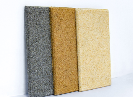 微粒材料是一種新型綠色裝飾材料,具備優異的聲學性和物理性能。該材料是以天然砂粒或經環保處理的固廢顆粒為骨料,以環保膠凝劑,通過壓振工藝,生產的具有大量相互連通的微小空隙的多孔材料。
